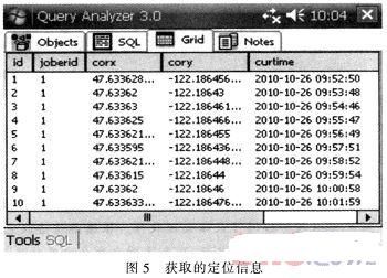 GPS信息采集用来记录巡检人员的路径信息,具有随PS同时启动功能,并自动运行于后台。利用开发的Microsoft.WindowsMobile.Sam ples.Location类库获取GPS定位信息,包括经度、纬度以及时间。该模块每隔一定时间向数据库中存储定位信息和时间,提供给管理员作为评价巡检人员工作状况的要素。终端向CIPS传输数据或者CIPS机向终端传输数据时,在后台运行的GPS会终止向数据库写入数据,这样可以保证数据在传输过程中不会产生冲突。保证数据传输的安全性。图5显示的是定位信息存储数据。
