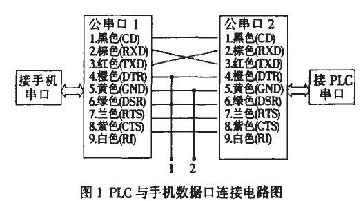 手机通过其数据口以串行方式可以接收/发送数据。手机的数据线采用RS-232接口标准,专为连接PC机的RS-232串口设计的;PLC串口的采用RS-485标准,通过RS-232到RS-485转换器就可以与手机数据线直接连接。本文采用的是在手机串口数据线与PLC串口之间进行了改动而进行连接,具体连接如图1所示: