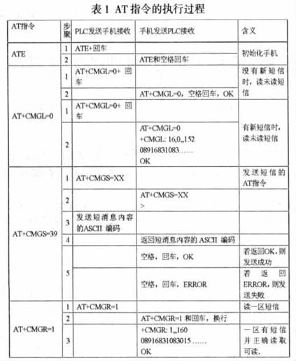 PLC与手机的软件接口是指PLC通过使用与GSM短信息有关的AT指令控制手机的控制技术,如读取手机的短消息内容,删除短消息内容,列出手机中还未读的短消息等。关于AT指令的功能描述请参考相关资料,此处不再赘述。AT指令的执行过程需要PLC与手机交互应答完成,每一次发送或接受的字节数都有严格的规定,二者必须依据这些规定实现数据交换,否则,通信就会失败。手机与PLC之间的数据传输采用ASCII码形式,为清楚了解PLC与手机的通信过程,在表1中没有采用ASCII码形式,而是采用字符格式进行说明。表1中列出了最常用的AT指令的执行过程,其它AT指令的执行过程与上述的基本相同。