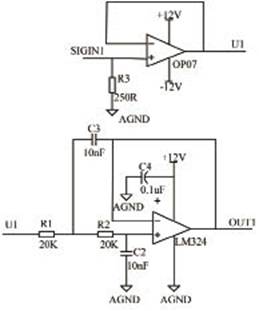 滤波,本质上是从被噪声畸变和污染了的信号中提取原始信号所携带的信息的过程。采集仪滤波电路如图2所示,因为滤波及AD转换信号为电压信号,所以在电流输入端加入了一个250Ω的精密电阻和一个电压跟随器,电流信号首先通过精密电阻转换为1V-5V电压信号,再经过电压跟随器进行阻抗匹配后进入滤波电路滤去高频干扰。对于电压输入则直接进入滤波电路进行滤波。在滤波电路中,因为巴特沃斯响应能够最大化滤波器的通带平坦度,特别适用于低频应用,其对于维护增益的平坦性来说非常重要,所以本设计采用巴特沃斯二阶低通滤波器。电压信号经过由运放LM324构成的二阶巴特沃斯滤波器进行低通滤波,滤波完成后,信号进入A/D转换模块进行A/D转换。根据巴特沃斯二阶滤波器特性可知滤波器的截止频率为: