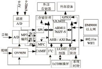 数据采集是指将温度、压力、电压、电流、位移、流量等模拟量采集转换成数字量后,再由计算机进行存储、处理、显示或打印的过程,相应的系统称为数据采集系统。随着计算机技术的迅猛发展,人们对工业安全生产和现代化管理要求越来越高,数据采集仪不但需要采集现场各种传感器信号,有时还需要进行音频和视频的采集和传输,以便监控人员可以更好的掌握现场信息。当今,虽然许多高速度、高分辨率、大存储量的高性能数据采集仪不断涌现,现有的数据采集仪仍存在CPU频率低、处理能力有限的问题。由于音频和视频信号的数据量巨大,单台便携式数据采集仪很难完成各种传感器信号与音视频信号实时的采集及传输,许多数据采集中都会采用多台设备把音频、视频和其它工业现场传感器信号分开采集传输的方式,这种数据采集方法具有安装维护成本高、占用空间大等缺点。