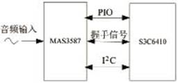 嵌入式产品一大特点是CPU资源有限,为了减轻CPU在数据处理中的负担及减少数据传输所需的带宽,本设计对采集到的音频和视频数据分别进行了硬件压缩编码。音频采集处理中采用Micronas开云棋牌官网在线客服设计及制造公司生产的MAS3587芯片。该芯片集成了前放以及A/D转换模块,支持模拟和数字串并行两种方式输入输出,具有MPEG1/2 layer3格式编码和MPEG1/2 layer2 and layer3格式解码功能。芯片内部包含耳机驱动模块,模拟输出信号可以不经过放大直接驱动耳机。音频采集电路如图4所示,MAS3587接收到模拟信号输入后,先通过芯片的A/D部分将模拟信号转换为数字信号,然后将A/D转换后输出的数字信号送入芯片内置的MP3压缩编码模块完成MP3格式的编码。图4中,S3C6410通过I2C总线对MAS3587芯片进行初始化,通过握手信号线与并行数据线读出经过MP3格式编码后的音频数据,并把数据进行存储及传输。