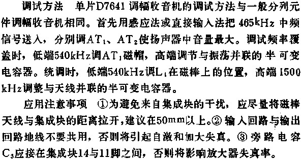 D7641单片调幅收音机电路,从变频到功放均集成在电路内部,使用外围元件较少,提高了整机的经济性和可靠性,该电路效率高,耗电比一般分立元件收音机省,电池寿命大约延长30%电源电压范围宽,在2~5V内均可获得稳定的接收灵敏度.因此适于装配在低电压下工作,耗电省的袖珍调幅收音机.
