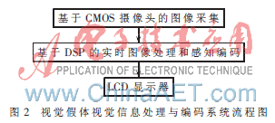 视觉假体视觉信息处理与编码系统可分为CMOS摄像头图像采集、基于DSP平台的实时图像处理以及LCD显示三个功能模块,其流程图如图2所示。其中,图像处理主要包括两个重要处理过程:感兴趣目标的提取和基于目标简化信息的视神经生理学模式(光幻视)编码,后者直接对应着微电极的刺激模式。
