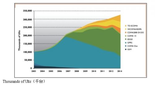 2009年1月,中国政府发放3G牌照。中国移动?接管TD-SCDMA网络,中国联通?和中国电信?分别接管WCDMA和CDMA网络。根据他们2010年发布的年度报告,中国移动已经部署了19.9万多个基站,到2011年中期将覆盖656个城市。据称,中国3G用户市场呈现井喷态势。而根据iSuppli2的市场分析,中国移动将在中国3G用户市场占据最大份额。图2是iSuppli?按照接入技术对2010-2014年的手机市场所做的预测。自从TD商用之后,中国移动便通过投资产业链推动TD市场。到2010年末,中国移动已经拥有2000万用户,截止2011年11月底,TD用户已突破4800万,2011年,TD用户有望净增3000万。