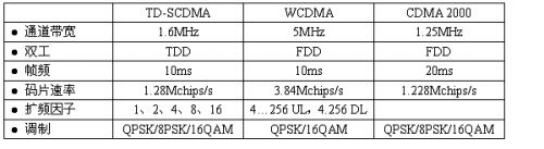 3G技术比较见表1。可以看出,TD-SCDMA与WCDMA和CDMA2000有许多类似的地方,但是都具备自己独有的特性。WCDMA与CDMA2000都属于频分多址技术。WCDMA需要两个独立的5MHz宽频谱带,一个用于下行传输(从发射塔到手机),另一个用于上行传输(从手机到发射塔),CDMA2000也需要两个1.25MHz频带。而TD-SCDMA仅需要一个1.6MHz频带,便可以满足上行和下行的传输。换句话说,TD-SCDMA仅需要频谱资源的1/6至2/3。在现有频谱紧缺的状况下,需要尽量少的频带可使部署移动网络更加简单。同时,它也节约了网络和终端设备的制作成本,因为需要采样的频带缩小。此外,由于上下行射频(RF)链工作于同一频带,因而可以很大程度地进行再利用。