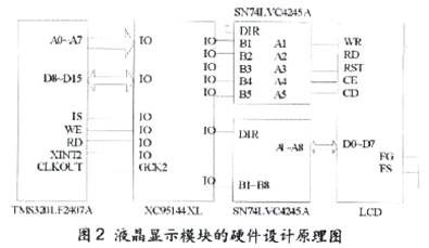 CPLD的设计主要是利用CPLD对键盘、液晶和各种状态指示灯进行控制。由于TMS320LF2407A的I/O管脚和各种特殊功能是复用的,如果将键盘、LCD显示以及各种状态指示灯直接和DSP相连的话,这将造成它的极大浪费,所以我们在它们中间用CPLD作为桥梁。