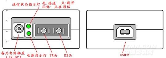 图2 光口通信状态指示灯以及电口(USB)插座