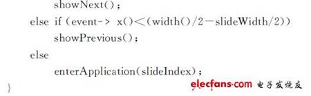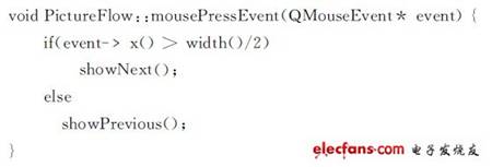 ④ 准备应用程序入口和相关图片。pictureflow默认会搜索当前路径上的图片,如果在pictureflow运行时将路径传入,就会搜索指定路径上的图片,并将图片以3D形式显示在显示设备上。pictureflow默认鼠标点击动作将使图片向左滑动或者向右滑动,因此必须修改点击屏中间区域的响应。详细代码如下:
