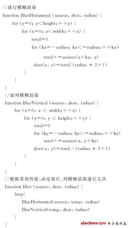 因为每张页面均有一张倒影,程序采用了一种模糊渲染算法,得到了页面的模糊倒影。在算法中,采用了行列分离的方法进行渲染,即取出源图片的某一像素点之后,依次获得该像素点的同一行的像素平均值作为目标点;然后再依次取出源图片的像素点,获得该像素点的同一列的像素平均值作为目标点。上述操作即处理流程,根据目标平台的性能可以将上述操作循环执行多次,以获得最佳模糊效果。得到页面的模糊倒影之后,程序以某个角度将页面连同倒影一起显示。具体代码如下: