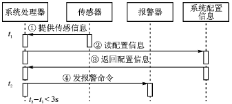 该系统的序列图如图1所示。从图1中可以看出,该系统要求从传感器返回信息到发出报警的时间间隔小于3 s。这就是序列图中对嵌入式实时系统时间要求的一个例子。