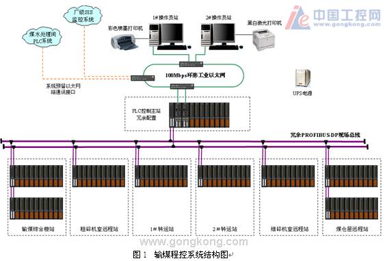 输煤程控采用双主机(热备)配置的HOLLiAS LK系列PLC完成上煤及配煤控制等功能,PLC置于输煤程控室。在粗碎机室、1#转运站、2#转运站、细碎机室、煤仓层、输煤综合楼设6组远程I/O 站,各信号就近引接至附近的I/O站,各I/O站及PLC之间采用冗余PROFIBUS-DP现场总线通讯。该网络能满足输煤程控的实时要求。在输煤程控室设上位监控系统,通过两台上位监控计算机机进行输煤系统的集中监测及控制,不再设常规模拟屏及仪表盘。