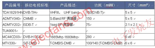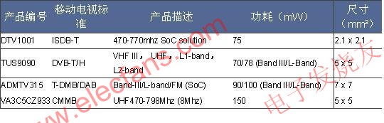 由于调谐器在信号灵敏度、噪声指数以及AGC(自动增益控制)方面的要求较高,频率超过1Ghz的RF信号也带来了EMC的问题,这给OEM厂商设计带来一定的难度。更多的调谐器产品是结合解调器核心或者IC一起,作为一个SiP IC或者AFE 模块供应,较小的AFE模块甚至和一张SD卡一样可以直接通过SDIO接口来与后端的信源解码器(MPEG或H.264解码器)IC相连。来自TI的 HollywoodTM Solution DTV1000和DTV1001则是结合了调谐器和解调器功能,专门为移动电视设计的产品。DTV1000工作在UHF和L-band频率范围,适用于 DVB-H标准,DTV1001符合ISDB-T标准。Infineon的OMNIVIATM TUS9090使用0.13um RF-CMOS工艺,在VHF、UHF和L-bands频带支持DVB-T/H标准。Sharp公司在2008年底专门为中国移动电视市场开发一款VA3C5CZ933,在 UHF470-798Mhz频段支持CMMB标准。具体信息如下所示: