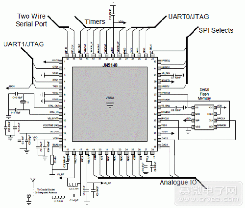 图6。JN5148-001采用印刷天线参考模块电路图