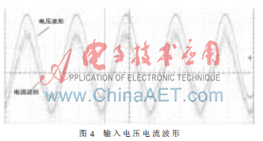图4是用示波器测量加PFC时的输入电压、电流波形。系统加PFC后,网侧输入电流为较标准的正弦电流波形,且能很好地跟随输入电压,对谐波起到了良好的抑制作用。
