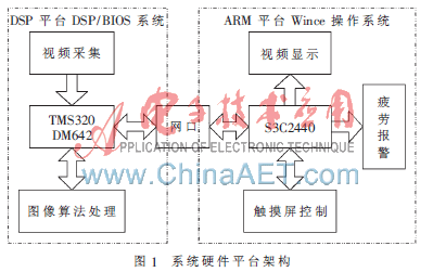系统硬件平台选用三星公司ARM9架构的S3C2440作为核心处理器,利用TI公司的TMS320DM642作为视频采集处理模块,其结构框图如图1所示。DSP平台主要负责采集图像、图像算法处理,ARM平台主要完成整个系统的控制处理,两者之间通过网口实现通信和同步。在系统运行过程中,ARM平台可实时显示采集到的视频以及相应眼部疲劳特征识别的结果,同时用户可通过触摸屏交互界面对系统进行设置和控制。为保证系统平台具有高的可靠性以实现复杂的系统调度,在设计过程中对本系统各平台进行了操作系统移植,DSP平台移植了DSP/BIOS系统,ARM平台移植了Wince操作系统。