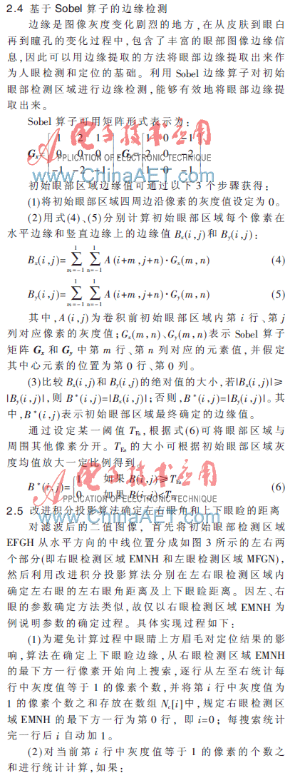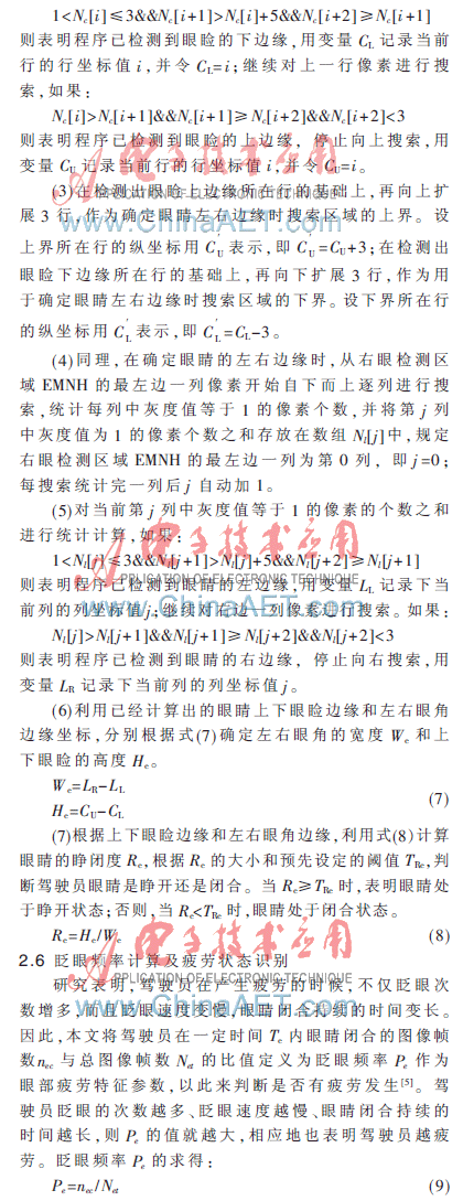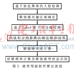 首先,根据脸部肤色的聚类特性检测驾驶员脸部位置,在人脸检测的基础上,根据眼睛在人脸上的几何位置分布,确定眼睛的大概位置,缩小眼部检测的区域范围;其次,在缩小的眼部搜索区域范围内,利用Sobel边缘检测算法对眼部区域进行边缘检测,提取眼部的边缘信息,并对其进行二值化处理;再对二值化后的眼部区域进行连通成分分析,采用基于区域连通的二值图像滤波方法去除眼部周围图像噪声点的干扰;然后根据改进的积分投影算法,计算左右眼角和上下眼睑的距离,确定驾驶员眼睛的睁闭状态;最后,定义眨眼频率,并据此实现疲劳驾驶的检测。具体的算法流程如图2所示。