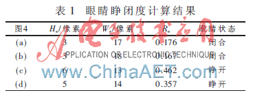 通过观察发现,通常情况下,驾驶员在睁眼和闭眼时,左、右眼的睁闭情况是同步的,即同时睁开或同时闭合。因此,在对眼睛睁闭状态进行判断时,为减少计算量,仅对左眼的睁闭情况进行判断。针对图4所示的眼部区域检测结果,利用式(8)计算其左眼睁闭度的大小,计算结果如表1所示。