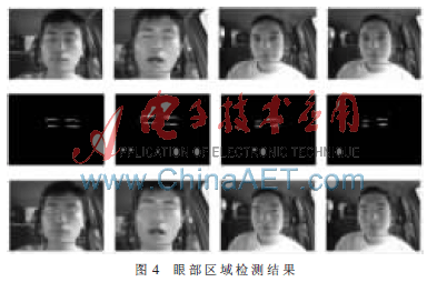 为验证眼睛疲劳特征检测算法的有效性,在构建的ARM+DSP系统上对采集到的视频图像进行实验验证。在沪宁高速南京段的实验结果表明,该系统将算法处理时间控制在50 ms以内,取得了良好的实时效果,疲劳驾驶检测正确率达97.6%。部分图像的眼部区域检测结果如图4所示,其中,第一行为人脸检测后的面部定位图像,第二行为经Sobel边缘检测后的眼部二值图像,第三行为得到的眼部边界定位图像。