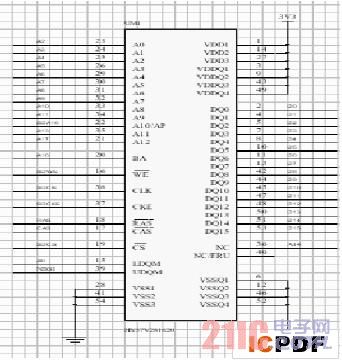 本文采用了两片Hynix公司的HY57V281620BTSDRAM芯片,16MX16位数据宽度,共64MSDRAM。AT91RM9200内置有SDRAM控制器(SDRAMC),具有SDRAM控制接口,为简化电路设计提供了很大的方便,电路如图1所示。