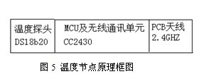本无线传感器节点采用无线SOC片上系统CC2430,在单个芯片上整合了ZigBee射频(RF)前端、内存和微控制器,温度传感器采用DS18b20,其原理图如图5所示,节点外观如图6。