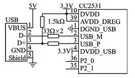 CC2531的USB硬件连接很简单,如图3所示。采用USB总线供电方式,通过电压转换芯片AM11173.3为硬件电路提供3.3 V电压(图中未画出)。由于该设备为全速设备,因此D+信号线通过电阻上拉。