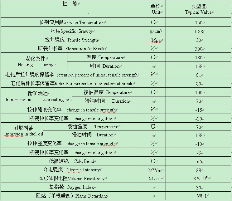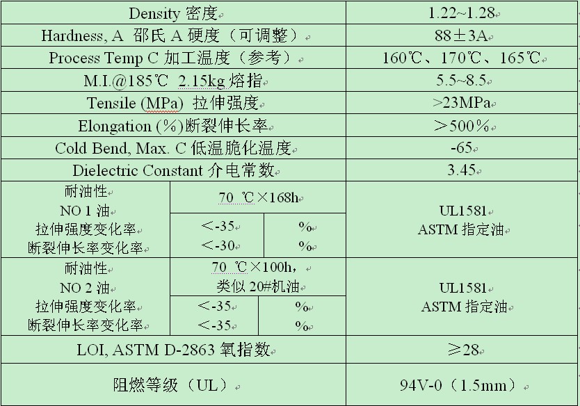 (3)产品性能特点:优异的阻燃性和出色的耐高低温性(-60℃-+150℃)、高度耐油性、耐候性、优异的抗蠕变性和耐疲劳性、极好的低温柔韧性和低的摩擦表面、良好的耐水解性等。