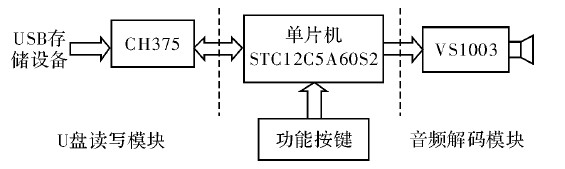 播放器的工作过程是: MCU 通过CH375 读取来自USB 存储设备的数据,并依据功能键的控制指令,将USB 存储设备的相关数据送入音频解码模块,在VS1003 解码后,送入扬声器或耳机。设置6 个人机交互功能按键,分别实现播放、暂停、上一曲、下一曲、增大音量、减小音量等基本操作功能。