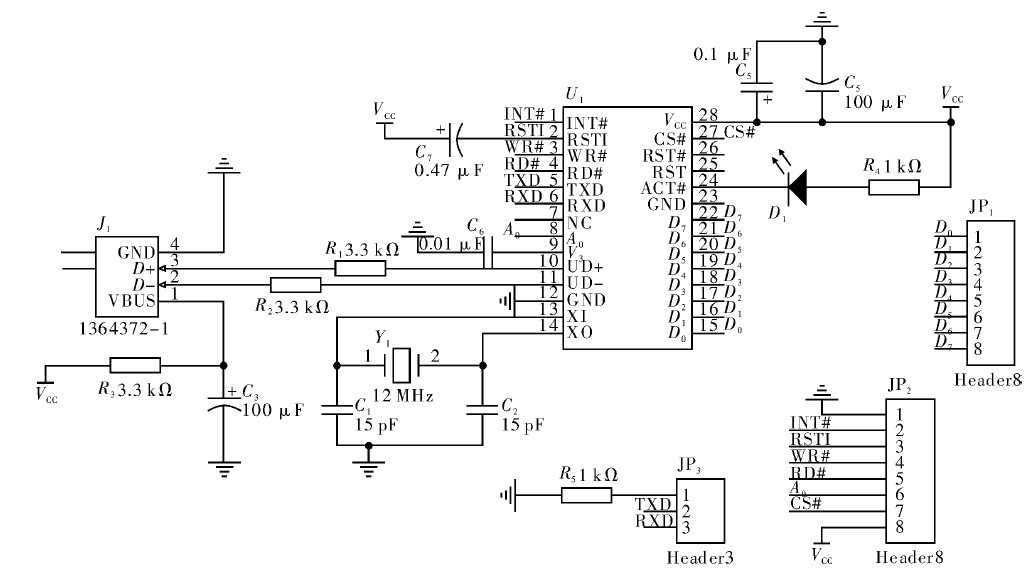 设计中,CH375 采用主机方式,图中J1为USB 插座,可连接U 盘等存储设备,D1为指示LED,当检测到USB 设备连接时灯亮。当TXD 引脚连接到地时,CH375 工作在并口方式,此时图中JP1接口D0 ~ D7为双向数据总线,连接单片机。