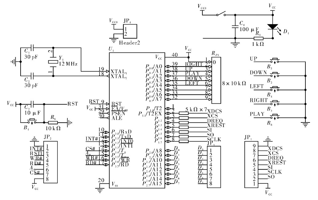 图3 为播放器MCU 模块的硬件电路原理图,其中, JP4为电源输入接口,D1为电源指示灯,排阻Rp1为P0口的上拉电阻。JP2和JP3接到U 盘读写模块对应的接口上。由于单片机在5 V 电源下工作,而VS1003在3. 3 V 电源下,所以工作P1口应该接限流电阻到JP1再到音频解码模块对应的接口上。电路设置5 个功能按键,"UP"为增大音量,"DOWN"为减小音量,"LEFT"为选择上一曲,"DOWN"为选择下一曲,而"PLAY"为播放/暂停键。