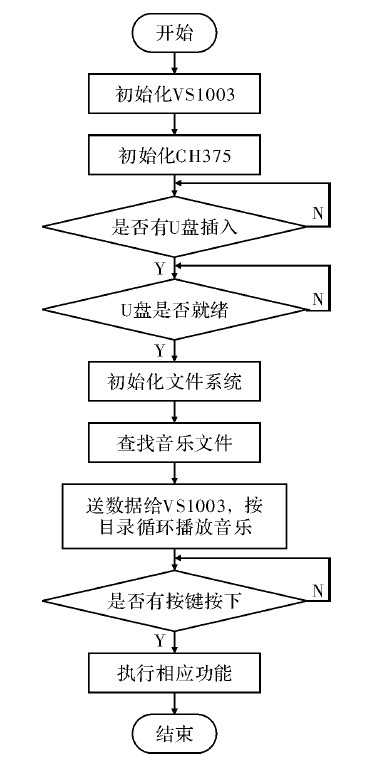 单片机程序主要解决读取CH375 数据,和写入VS1003 寄存器用于播放音乐两个问题。其中,5 种功能分别与图3 的5 个功能按键一一对应。软件程序流程图如图5 所示。