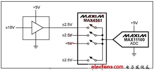 还可以使用输入放大器对信号进行缩放,使其与低压ADC的满量程输入范围相符合。这种信号调理电路可以连接到一个多路复用输入,从而使所有的信号都能与ADC的范围相符合(图3)。