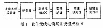 软件无线电对通信侦察提出了新的挑战。显然,工作频率范围不宽、功能单一的传统通信侦察设备对付不了频段宽、工作方式灵活、能够兼容现役各类电台功能的软件无线电通信电台。因此,通信侦察系统必须采用软件无线电模式才能满足实际的需要。软件无线电通信侦察系统结构图如图1所示。
