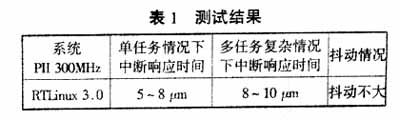 我们采用RTLinuxv3.0来开发预处理系统。从资料上看,RTLinuxv3.0为某些嵌入式处理器提供低于10μm的中断响应时间(最差情况),为标准PC提供低于20μm的中断响应时间(最差情况)。为了进一步验证RTLinux是否满足项目实时性能的要求,我们对它的实时性能指标进行了测试。由于在项目中主要的技术指标是中断响应时间,我们采用并口中断的方法进行测试中断响应时间。在PII300MHz的PC机上做一个并口中断卡,每10μm中断一次,测试中断响应时间,结果如表1所示。从测试结果可以看出,RTLinux具有很好的实时性。