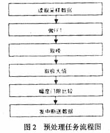 在整个软件无线电通信侦察系统中,预处理的任务是实时快速地对采集的信号进行(快速傅里叶变换)变换(FFT),然后取模取极大值,经过门限比较后将稀释的预处理结果数据送给主处理机,进行结果显示和进一步的处理。可见预处理在整个系统中起到关键的作用,要求预处理必须实时高速。预处理任务流程如图2所示。