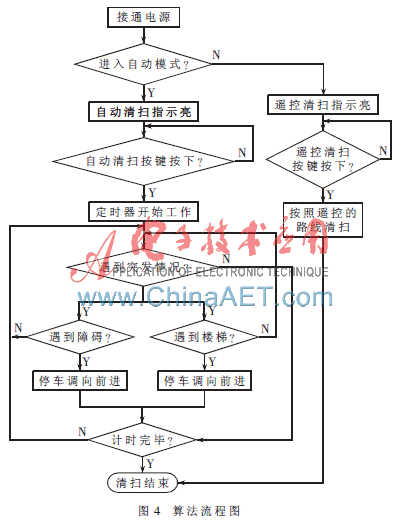 硬件设计调试完成后,还要进行软件系统设计。在C语言文件中编写C程序进行SoPC的编程[10]。平台工作总体算法流程如图4所示。平台接通电源,首先初始化进入自动清扫和手动遥控清扫二选一模式;当选择自动清扫模式时,通过键盘输入平台自动清扫工作时间,在清扫过程中通过传感器判断是否遇到障碍物或楼梯并进行处理。通过中断,时刻查询是否到达设置时间,如果没到,则程序返回运行;如果设置时间到,则程序结束,平台停止工作。当选择遥控清扫时,平台运动受操作者的控制。