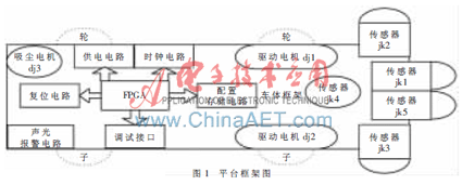 本文提出的平台整体框架设计如图1所示,用装有四个轮子的小车作为整个平台的载体。以FPGA控制器作为整个平台的主控器,通过I/O与光电传感器jk1、jk2、jk3、jk4及碰撞开关jk5相连,实现平台障碍的检测;通过I/O输出PWM波形,驱动扬声器和高低电平的变化以驱动LED的亮灭,组成声光电路;通过控制电机驱动器的信号控制线来驱动步进电机dj1、dj2和直流吸尘电机dj3,实现平台的移动和吸尘。