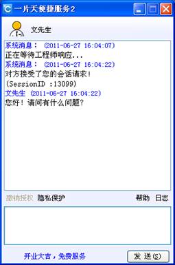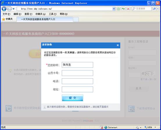 点击远程协助或者在线交谈按钮,都可以快速的与服务商建立会话。我们点击远程协助按钮,在弹出的身份识别窗口,输入称呼后提交。