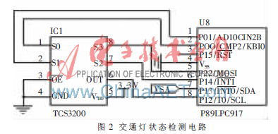 交通灯状态检测电路用于识别当前交通灯信号的指示状态,如红灯、黄灯、绿灯等,文中采用TCS3200作为交通灯状态检测传感器。TCS3200是TAOS公司2009年推出的可编程彩色光到频率的转换器,它将硅光电二极管、电流频率转换器和红绿蓝(RGB)三种滤波器集成在单一的CMOS电路上,在单一传感芯片上包含了64只光电二极管,其中,带有红色、绿色、蓝色及不带任何滤波器的光电二极管各16只。光电二极管在芯片内交叉排列,能最大限度地减少入射光辐射的不均匀性,增加颜色识别的精确度;同类型的16只光电二极管并联连接且均匀分布在二极管阵列中,可以消除颜色的位置误差。基于TCS3200的交通灯状态检测电路如图2所示。