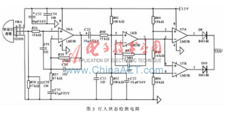 采用响应波长在5.5~14 ?滋m的热释电红外传感器D205B作为行人状态检测模块的探测传感器,人体辐射的红外线经过菲涅尔透镜聚焦后,产生交替变化的红外辐射高灵敏区和盲区照射到热释电红外传感器D205B上。运算放大器U6A对D205B输出的微弱电压信号进行第一级放大,然后由C22耦合至运算放大器U6B进行第二级放大,同时将电位抬高至0.5 VCC,再经由电压比较器U7A、U7B组成的双向鉴幅器处理后,检出有效的触发信号VSA并送至微控制器LPC917。