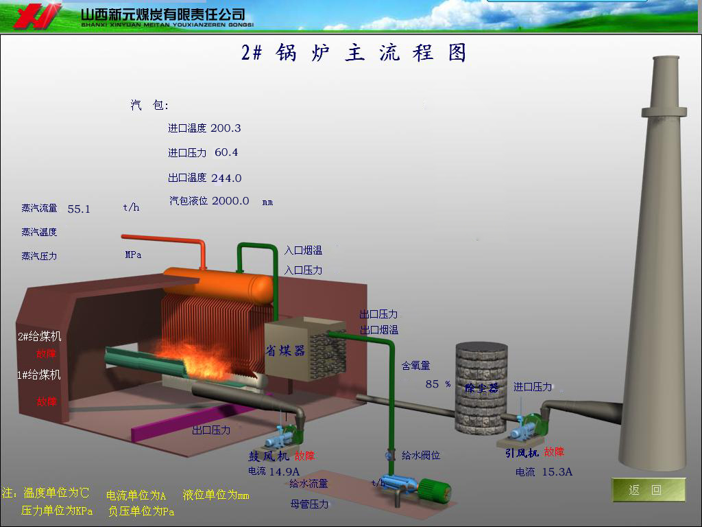 煤矿锅炉房主要为煤矿职工洗浴和食堂、冬季取暖等需热部门供热应用。一般采用燃煤锅炉,锅炉房监控分炉子自身的送煤、引风、炉膛温度、水或汽包温度、水位、烟气监控以及各类控制设备运行状态监控等。