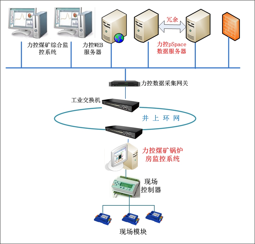 井上锅炉房数据均通过数据采集模块采集到锅炉房控制设备,并且汇总到煤矿锅炉房监控子系统软件平台,同时通过井上工业以太环网交换机,将数据接入力控煤矿综合自动化系统平台。