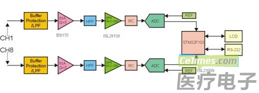 心电图机主要进行心脏问题自我检测,不仅可以检测出多种常见心脏问题(如早博、二联、三联等),迅速输出结果,同时保存多组数据,包括心脏波形及结果分析。本设计中,通过专用电极从人体采集到心电信号后,送入信号调理电路,先经过前置放大器初步放大,经高通滤波滤除直流信号及低频基线干扰后,由后级放大器放大,再经滤波器进一步滤除50Hz的工频干扰,经低通滤波器后得到符合要求的心电信号,由模拟输入端送入ADC,进行高精度的A/D转换。系统采用ST公司的STM32F103作为MCU,采集到的信号可以通过LCD实时显示和回放,为医护人员及时准确的诊断提供参考。