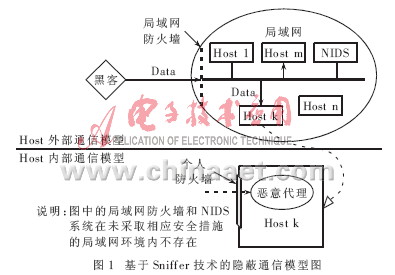 通信原理:黑客事先知道Host k所在网段的IP地址范围,因此黑客构造IP报文,其目的地址为局域网内某台主机的地址(可以随便设定),源地址也可以随意设定,然后向局域网内发送报文。Host k中的恶意代理使用Sniffer技术监听网络数据报文,并且依据黑客事先设定的通信协议来辨别和提取黑客的数据报文。这样就构造了一条隐蔽信道,实现了隐蔽通信。
