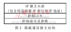 实验方法:通过在局域网外的控制端向局域网内的主机A(未安装恶意代理)发送结构如图2所示的报文。观察局域网内的主机k(已安装恶意代理程序)能否接收并处理该报文。同时观察安装在主机k上的个人防火墙能否发现并阻止该隐蔽通信。