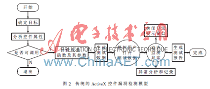 传统模型主要由测试前准备、测试阶段、测试后报告三个阶段组成。测试前准备阶段包括分析Web控件属性、分析函数及其参数、生成测试数据等;测试阶段主要包括模拟用户打开测试实例、动态异常监测和异常记录。图2所示为传统的ActiveX控件漏洞检测模型。