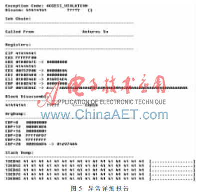 对异常列表中的每一项可以查看其详细报告。利用论文提出的Fuzzing测试模型对暴风影音mps.dll控件的导出函数OnBeforeVideoDownload()进行Fuzzing测试得到测试结果异常报告。图5是其中的一项详细报告。从中可以方便地获知异常发生的情况下的各种重要信息,包括异常类型、当前线程状态、当前SEH链表的状态、当前堆栈内存状态、当前各重要寄存器内容以及当前EIP附近的指令等。
