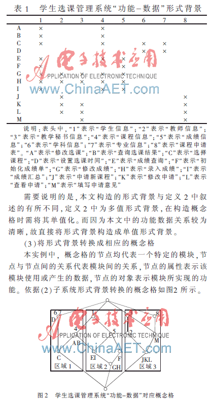 根据定义1中所述,形式背景由概念的内涵和外延组成,外延为对象集,在本方法中将功能集合作为对象集(即形式背景中的外延),以数据集合作为属性集(即形式背景的内涵),建立起两者的“功能-数据”二元关系。在这里,功能-数据的二元关系既包括功能产生对应数据这一关系,也包括该功能使用对应数据这一关系。结合实例,生成学生选课管理系统“功能-数据”形式背景如表1所示。