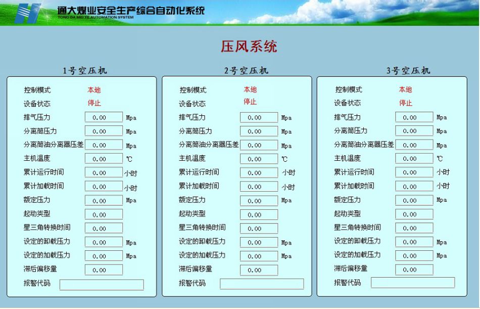 (1)压风机监控系统可以监控压风机排气压力、排气温度、风包温度、风包压力、管道流量、管内压力、压风机电压、电流、功率因数、运行状态(运行、备用、检修、故障)等参数,并将数据实时传输到地面计算机监控中心,并提供以上数据的历史数据查询、报警信息查询、及报表打印功能。