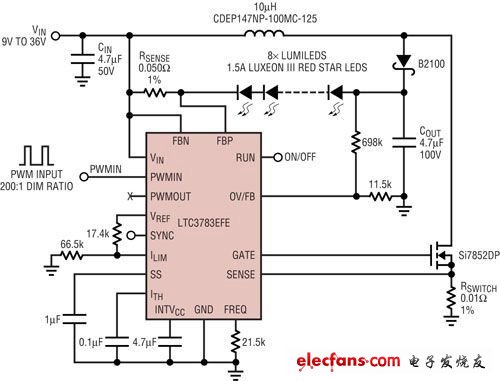 如图 4 所示,大功率 LED 驱动器 LTC3783 採用升降压架构,驱动用于汽车尾灯应用之6至10颗3W红光 LED。外部开关 MOSFET 和开关电流感测电阻为大功率和高压 LED 驱动器设计提供了最大的设计弹性。如果电池电压降至低于 9V,则9V 至 36V 输入和在电流为 1.5A 时,高达25V的LED 串联输出便需要100V的额定开关电压,以及高于 8A 的峰值开关电流能力。在整个汽车电池电压范围内,1.5A 恒定电池电流是良好稳定的,就刹车灯和尾灯调光而言,在 100Hz 时,可以透过直接连接到 LTC3783 PWM接脚的 PWM 信号降低 LED 电流,以实现高达 200:1 的调光比。在 1kHz 时,调光比降低至 20:1,这对尾灯应用来说已足够了。调节 ILIM 接脚也可降低 LED 电流。